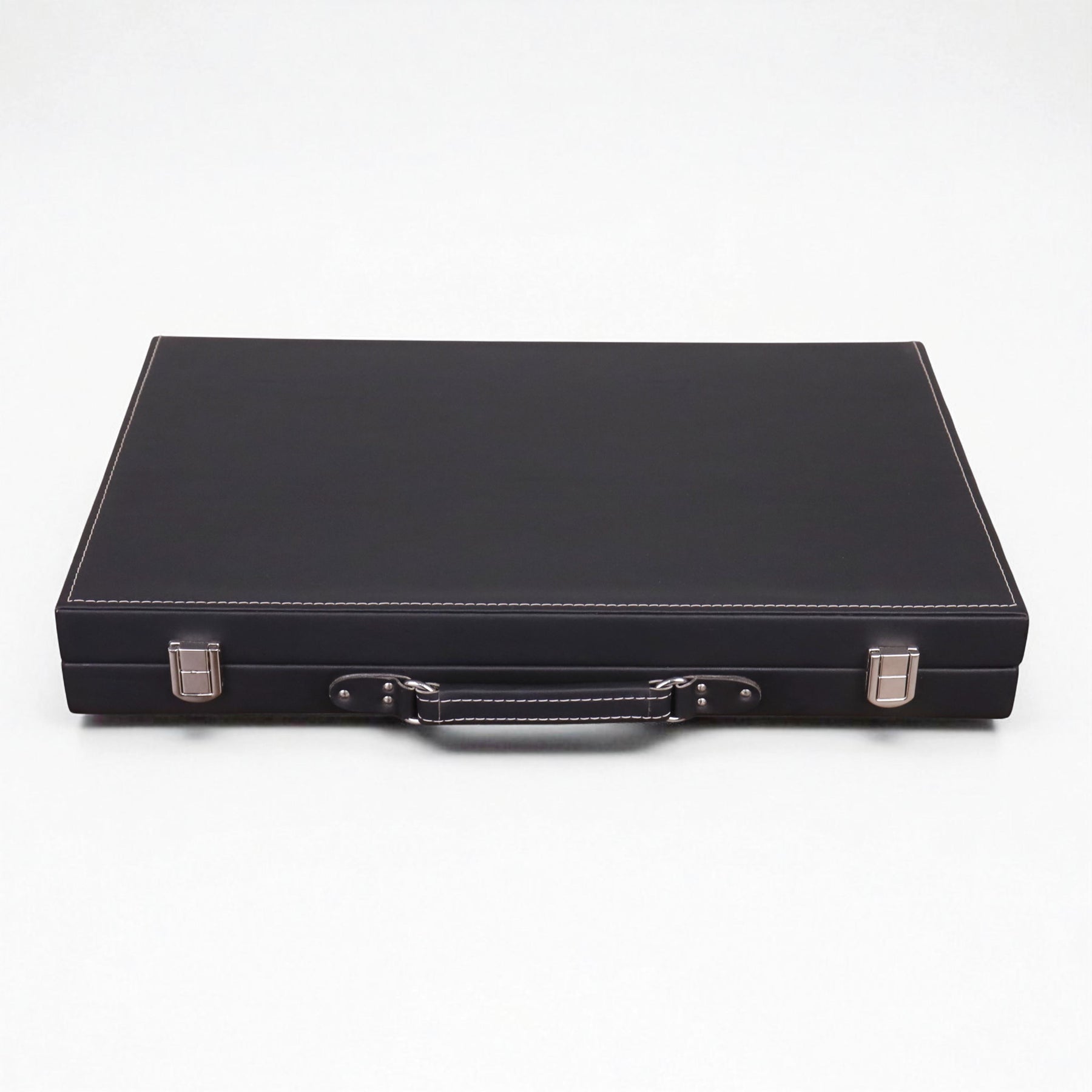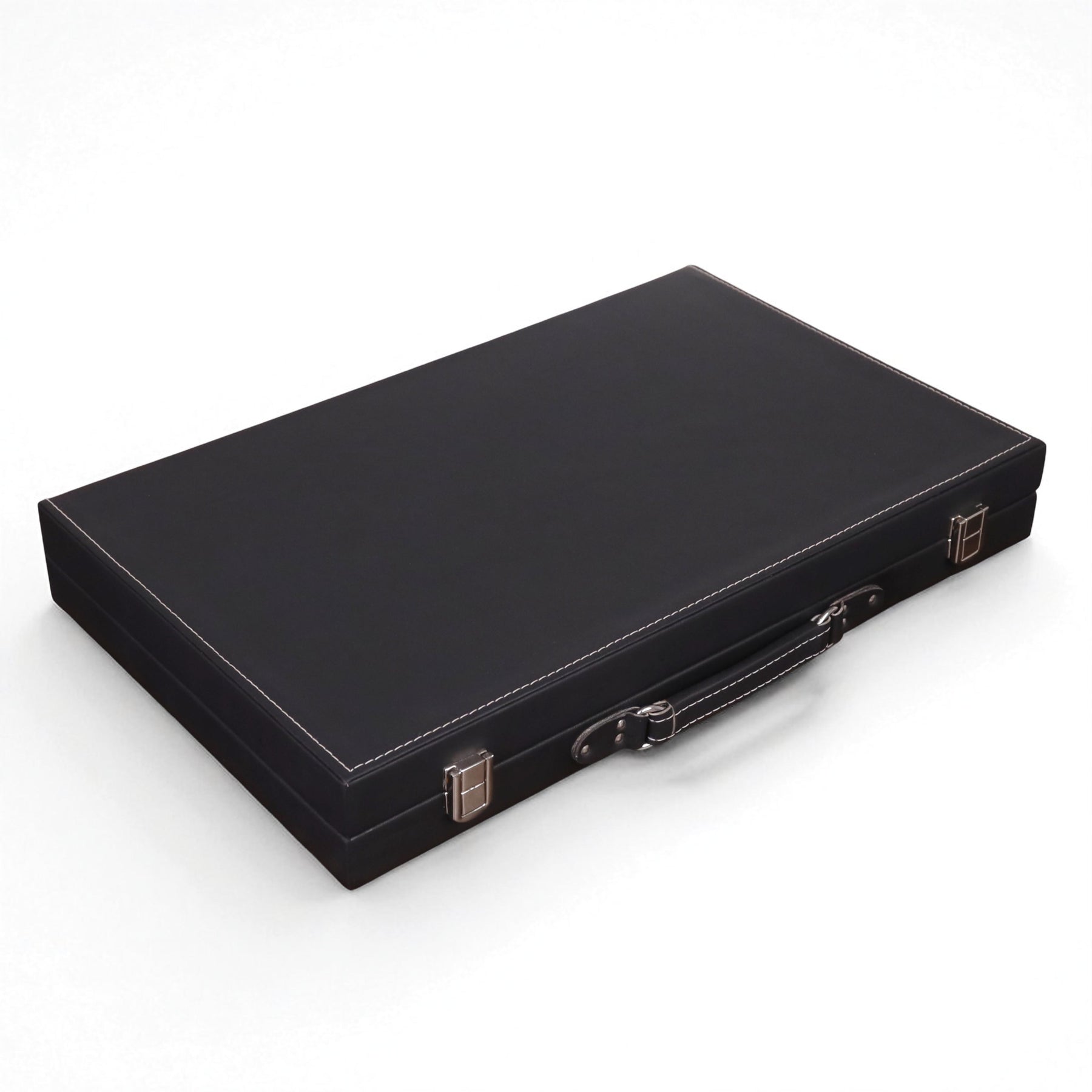 Bring elegance and tradition to your game nights with this 18" Ebony Black Leatherette Backgammon Set, designed in a refined briefcase style for easy portability and a sophisticated look. The smooth black leatherette exterior with detailed stitching exudes luxury, while the rich brown playing surface with striking red and cream inlays creates a bold and stylish contrast that enhances every match. Perfect for both casual play and serious backgammon enthusiasts, this set combines classic craftsmanship with modern durability, making it an excellent choice for home, travel, or as a distinctive gift.