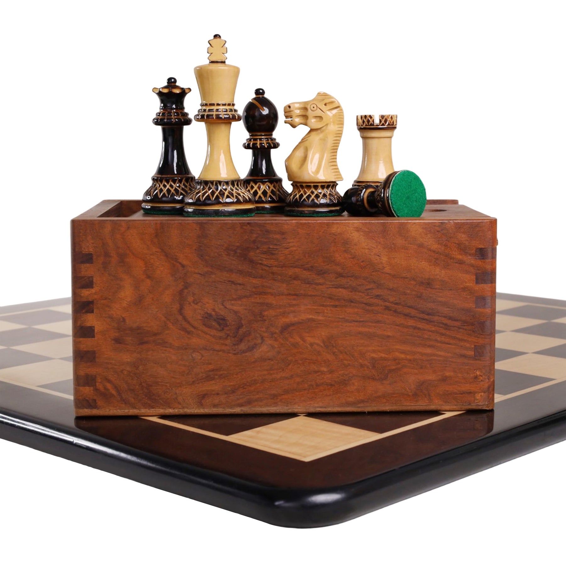 Combo of 3.9" Parker Staunton Carved Chess Set - Pieces in Lacquered Burnt Boxwood with Board and Box