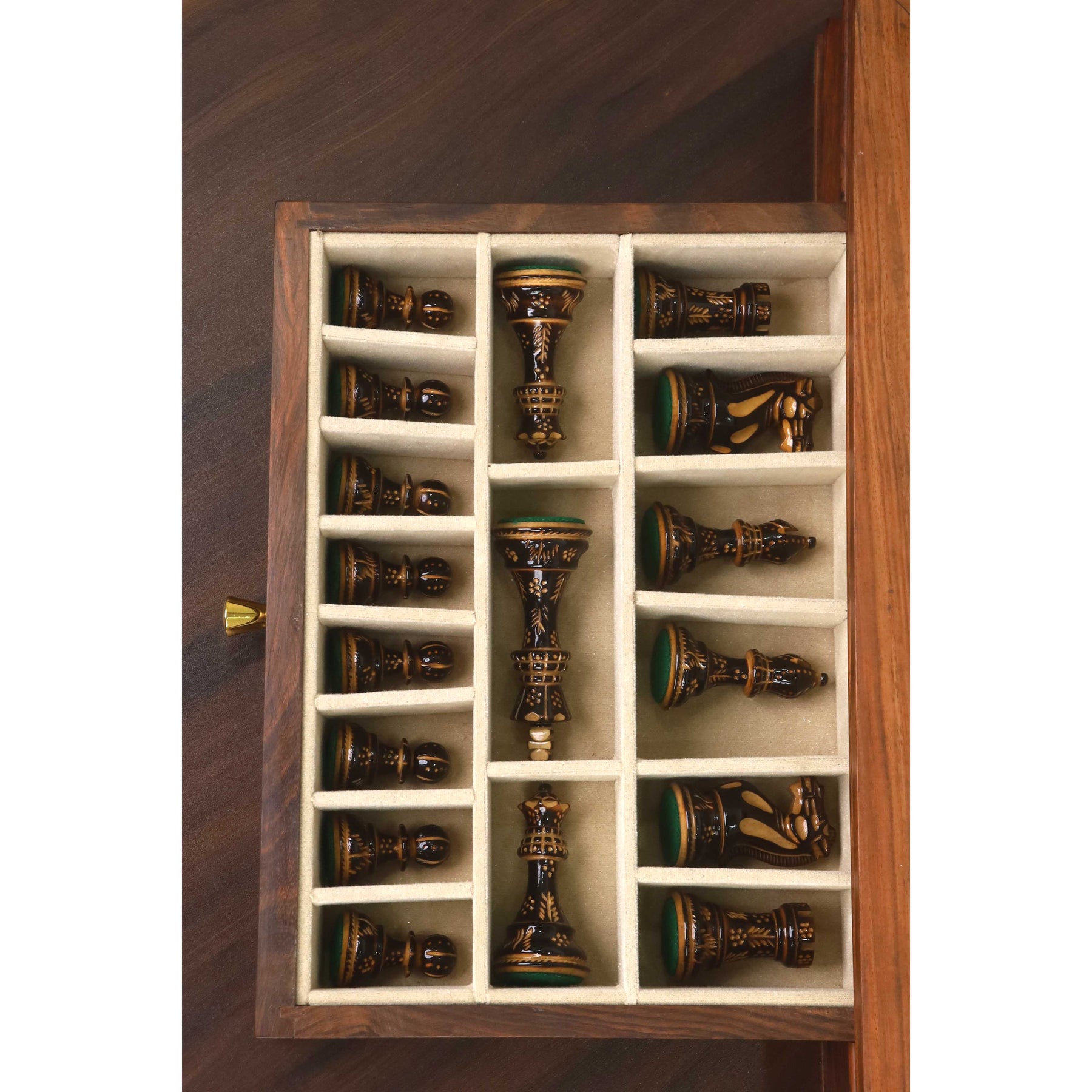 The board showcases rich grain patterns, a smooth polished surface, and convenient velvet-lined drawers to safely store every piece. The Staunton chessmen are expertly carved with elegant detailing—especially the knight—and finished in a striking gloss to enhance the natural beauty of Boxwood.