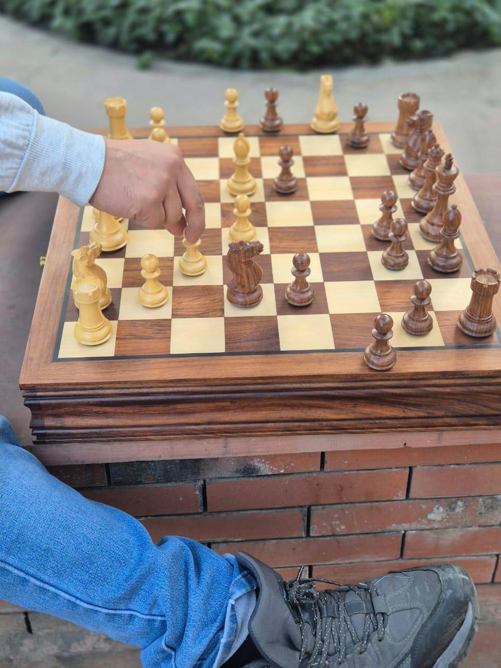 Using this chess set from few weeks now. Mostly evening time, sometimes at home, sometimes in nearby park with friends. Board is solid, once you keep it on bench or table, it doesn’t move much.