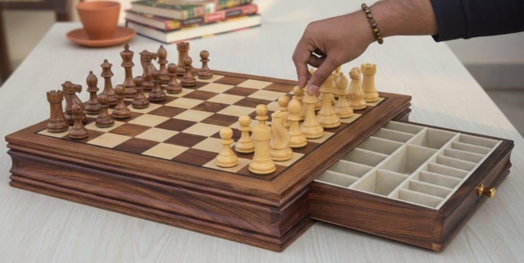 Pieces are nicely balanced and don’t fall easily, even when playing outside. After game, all pieces go back inside the drawers, so no tension of losing anything. I’m using it normally, not handling very carefully, still it’s in good condition. Feels like a chess set made for playing, not just for show.