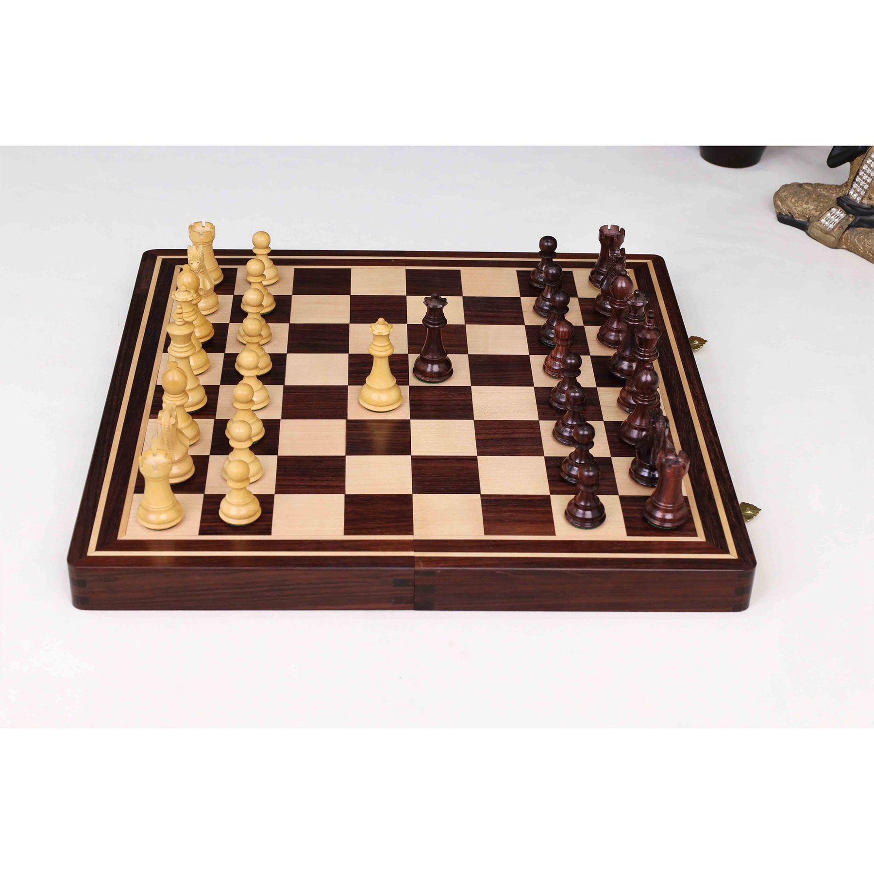 Experience refined craftsmanship with the 16" Windsor Executive Magnetic Travel Chess Set – Rosewood & Maple Wood Board with Rosewood Pieces. Designed for players who value both elegance and practicality, this set features a handcrafted Rosewood and Maple wood board paired with finely carved Staunton-style Rosewood and Boxwood pieces.